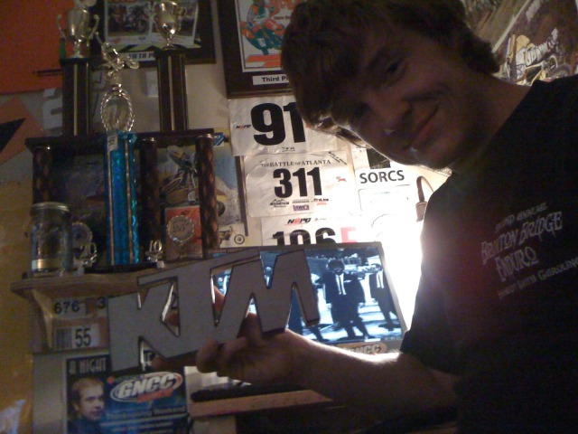 When I was in high school I took a couple of shop classes. One of which was an off campus class. I think that’s where I made a cool KTM logo on a band saw. Well, I mean, I started on a cool KTM logo. I never did finish it. What I had completed was the basic outline of the logo but I never did go back and cut out the inside of it. The chunk of wood sat on a shelf in my room for a few years then I took the initative to pick it up and finish it. Once it was completed I went back over it was some nice silver spray paint and topped it off with a nice black outline, hand drawn with a Sharpie I might add. Ok, so maybe it doesn’t look REALLY good but I figure it looks okay for something that it took me a few years to finish.
